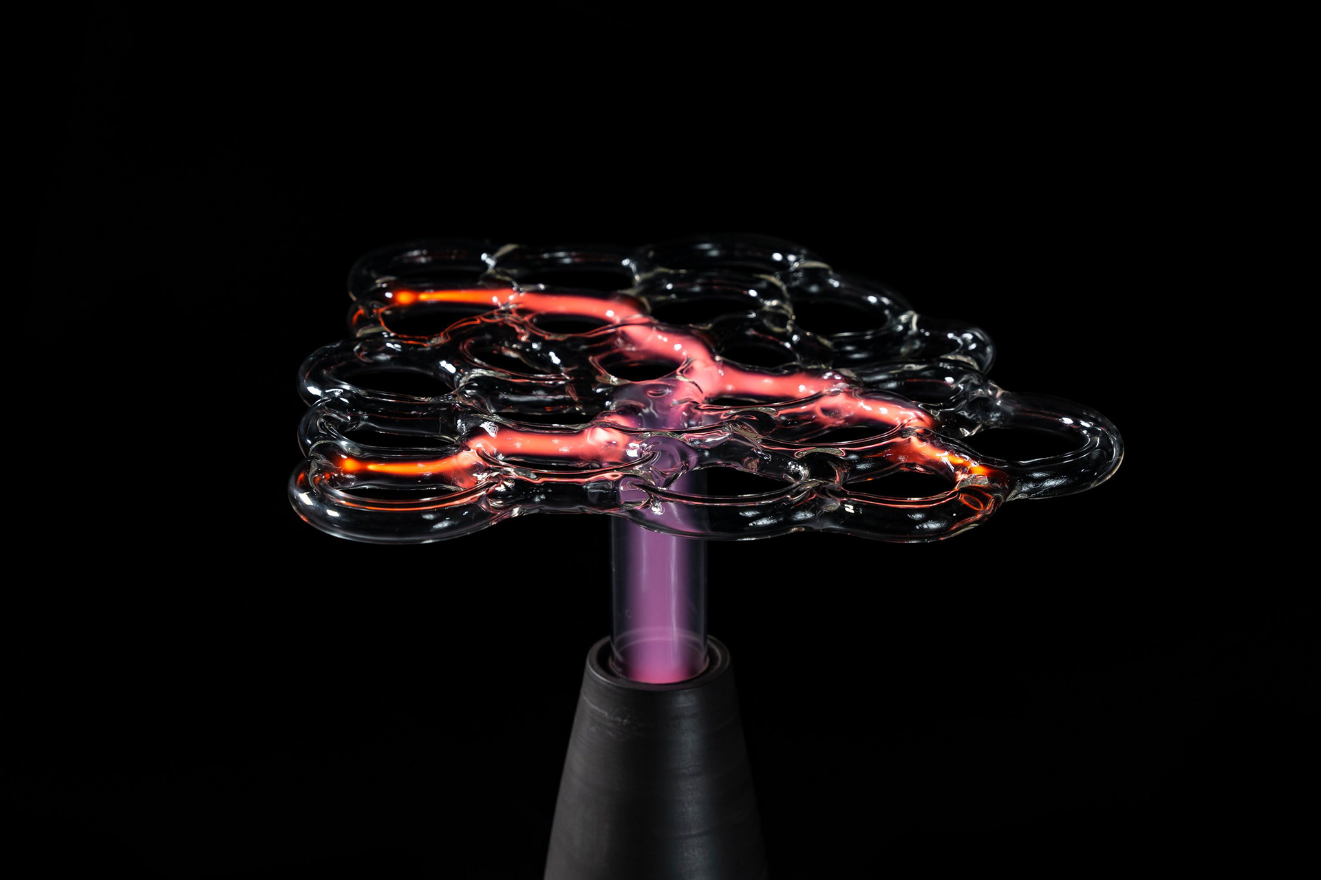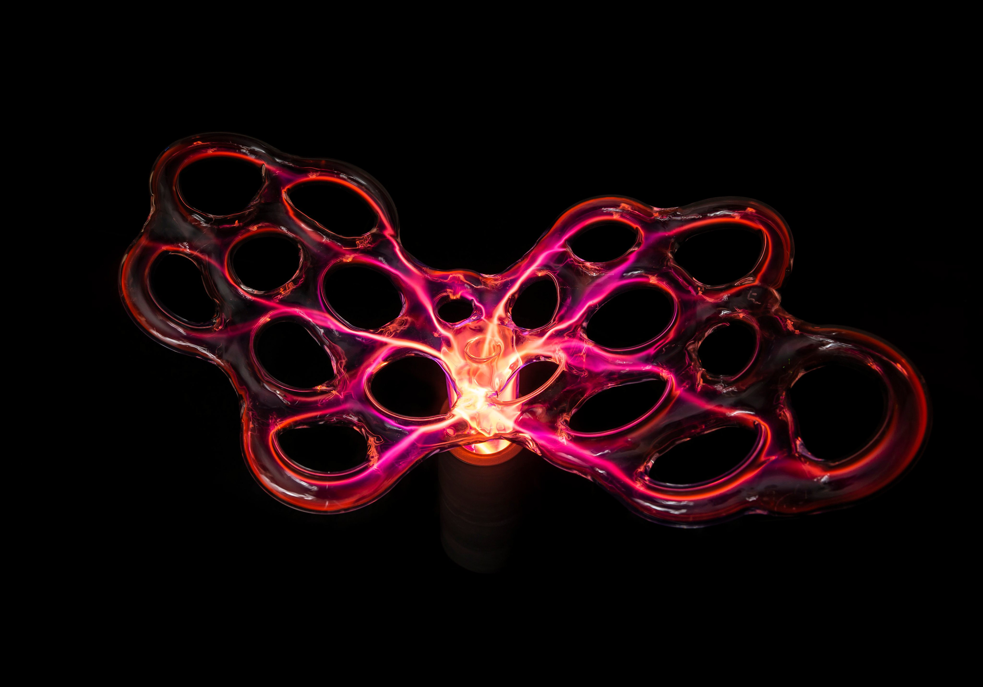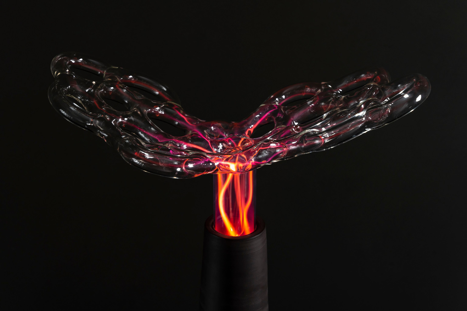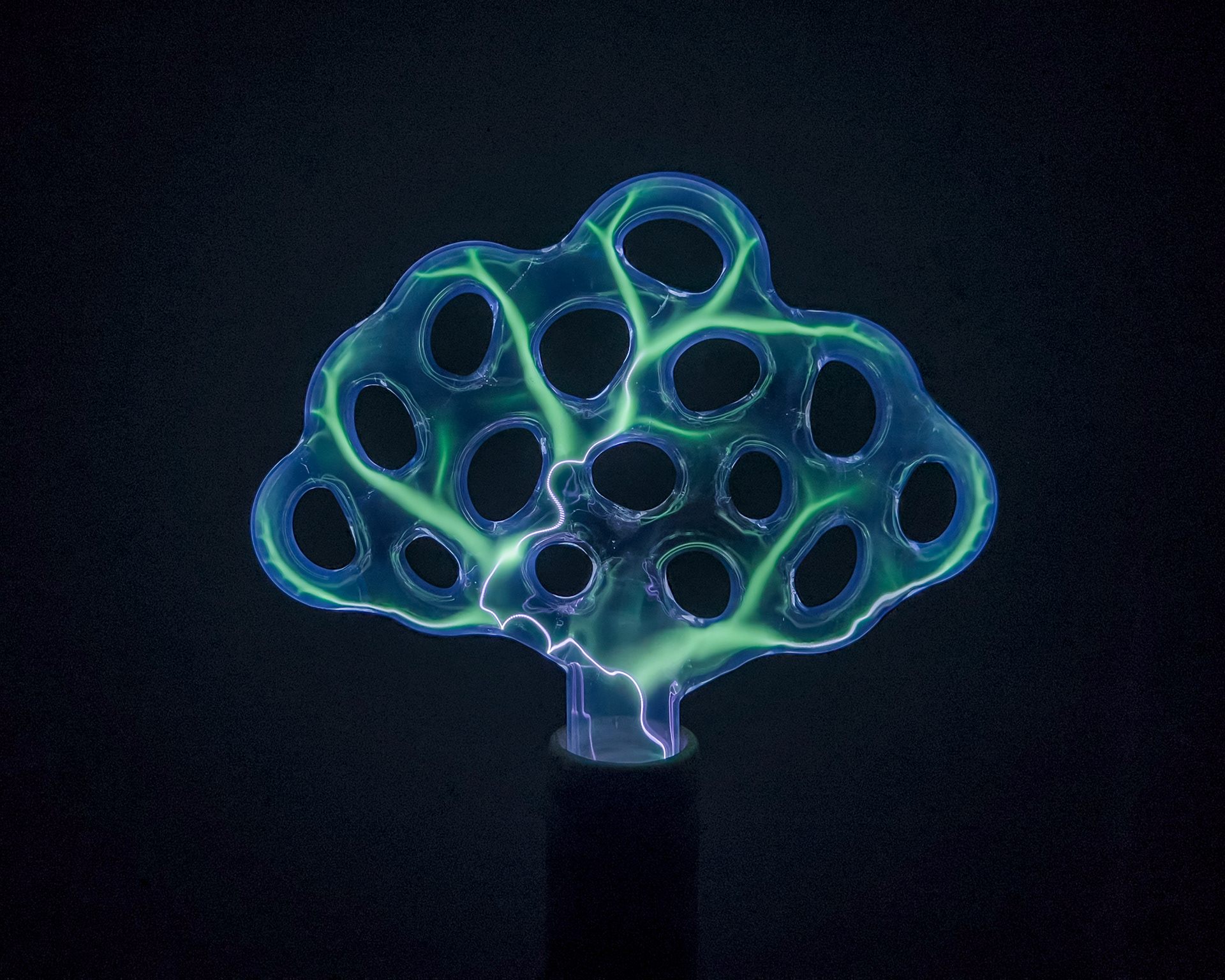 The glass surface forms an impenetrable barrier, concealing a world of selected molecules and atoms that engage in endless reactions with each other. I treat the glass as a surface of contact between two worlds, a skin that allows stimuli to travel in both directions. Though the plasma sculpture is not subject to external modifications once its form has been established, it can change internally and interact with its surroundings. The ability to influence it with our electrical potential creates the impression that the light discharge extends towards us — it lives inside its static glass exterior.
