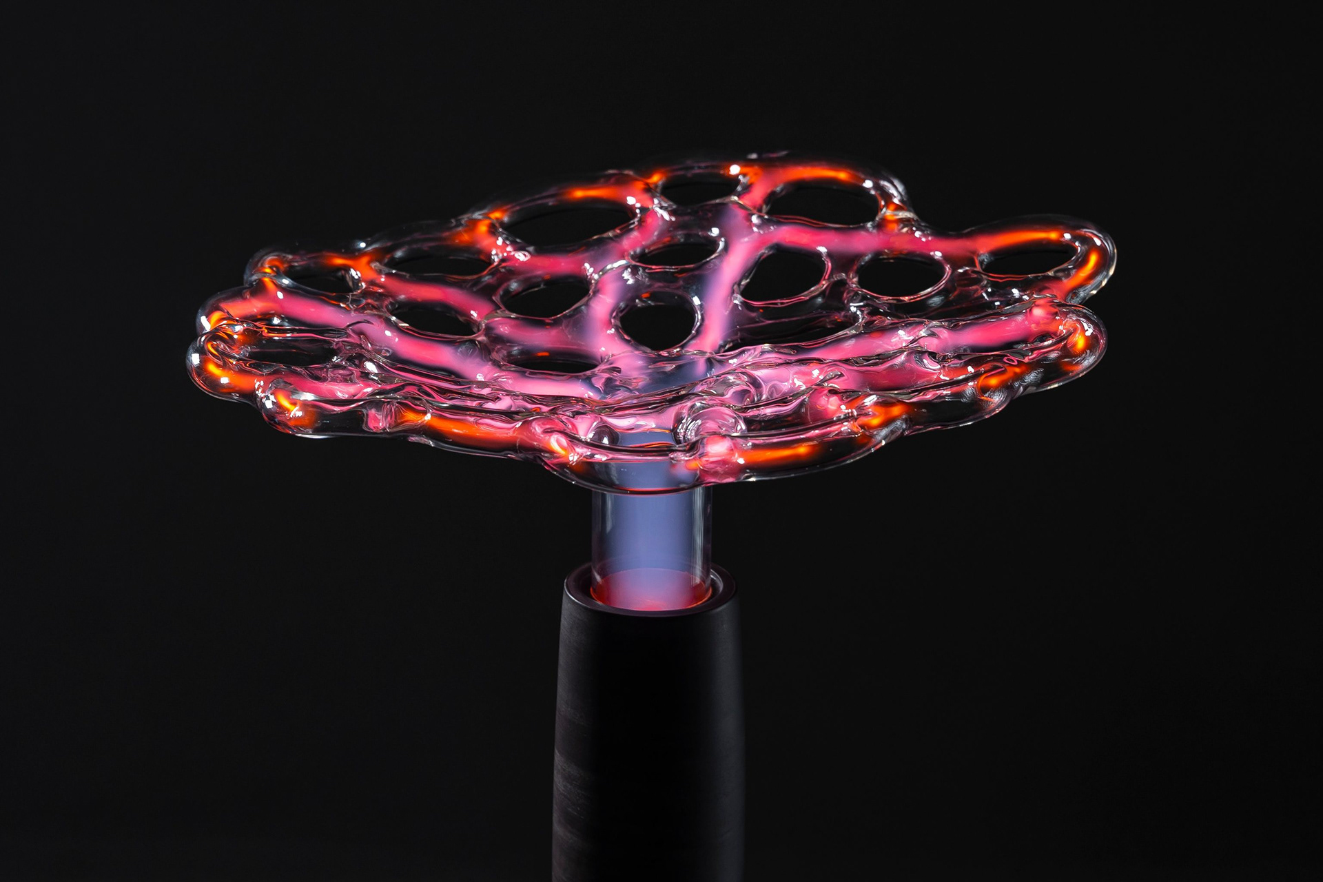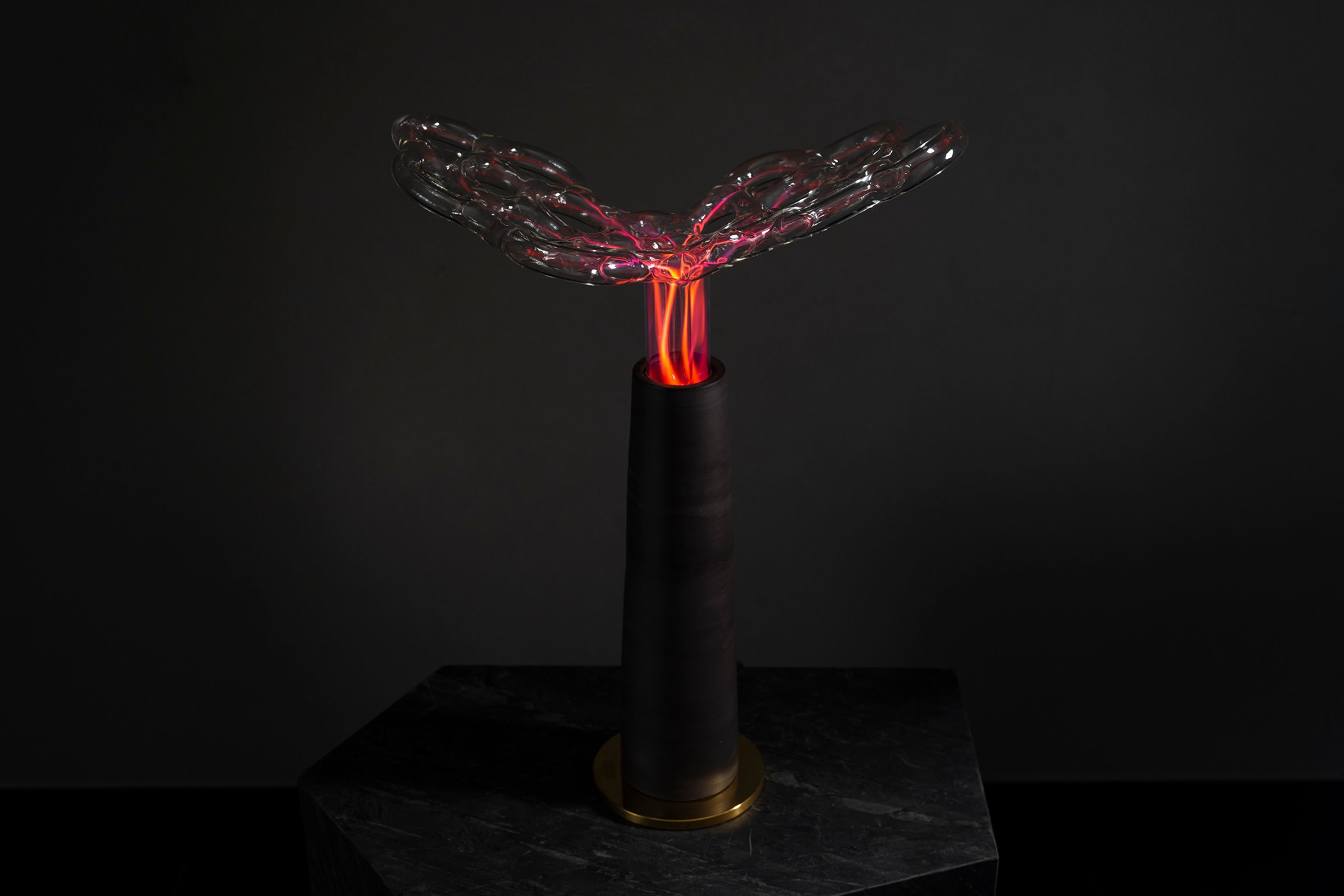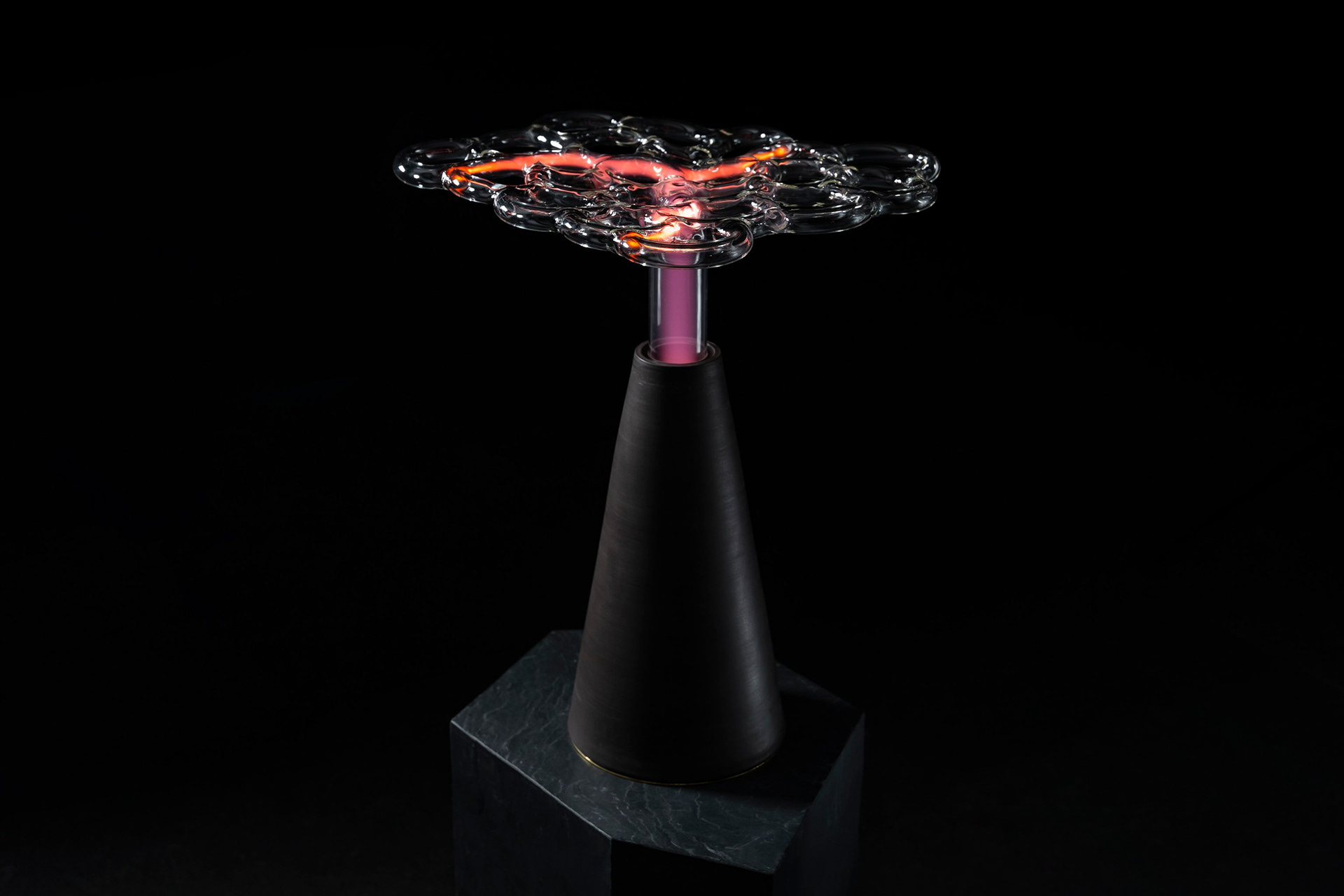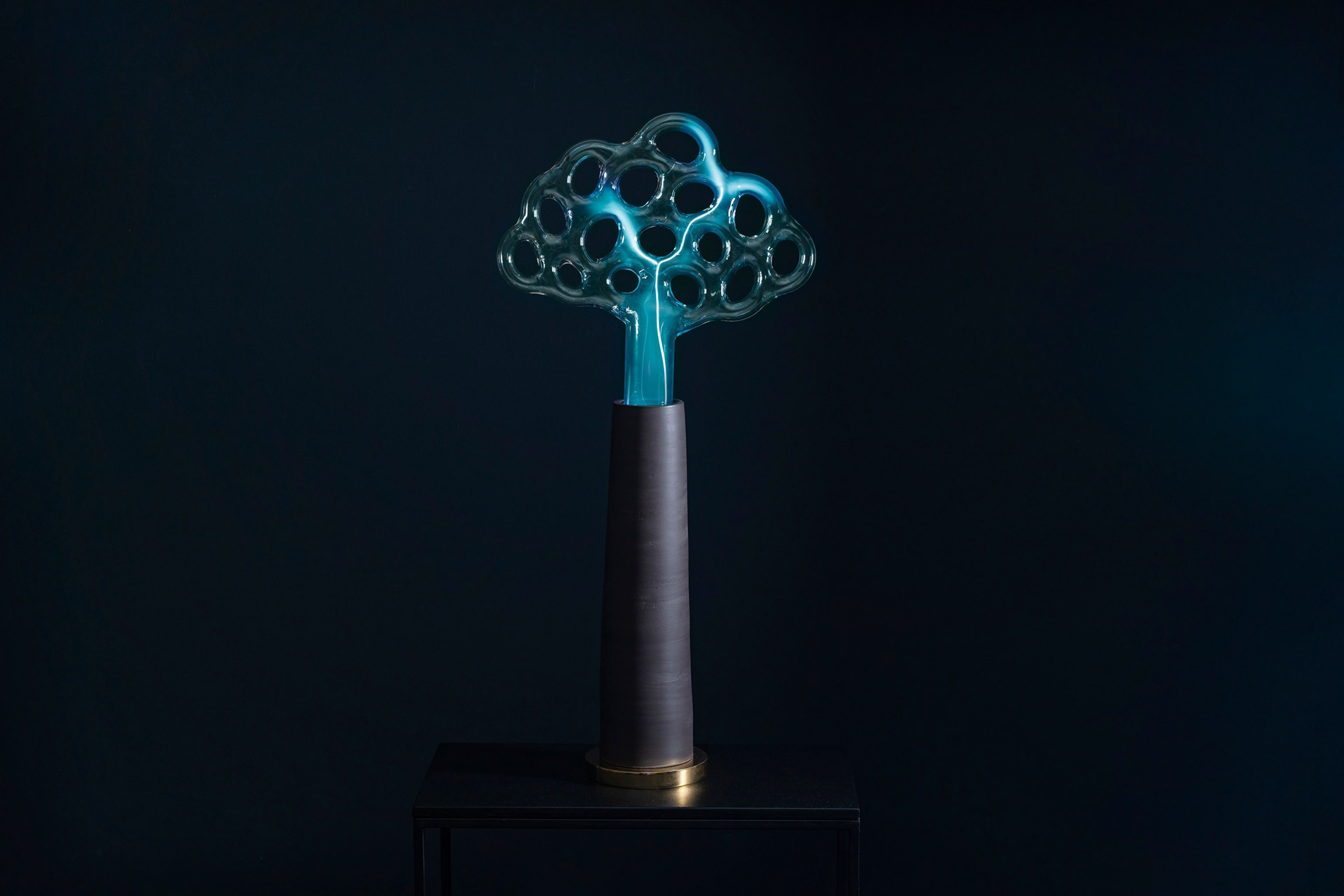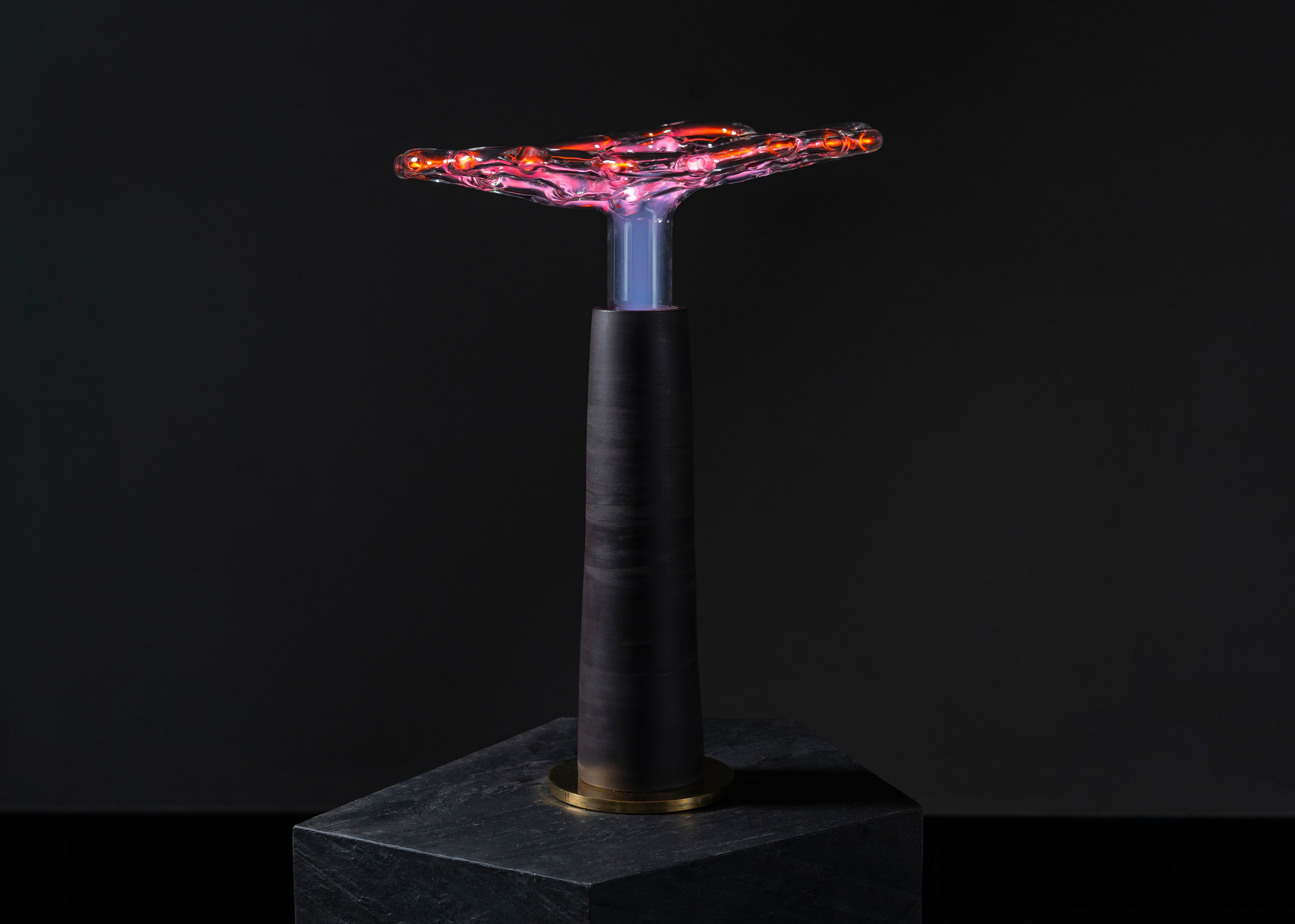 The glass surface forms an impenetrable barrier, concealing a world of selected molecules and atoms that engage in endless reactions with each other. I treat the glass as a surface of contact between two worlds, a skin that allows stimuli to travel in both directions. Though the plasma sculpture is not subject to external modifications once its form has been established, it can change internally and interact with its surroundings. The ability to influence it with our electrical potential creates the impression that the light discharge extends towards us — it lives inside its static glass exterior.